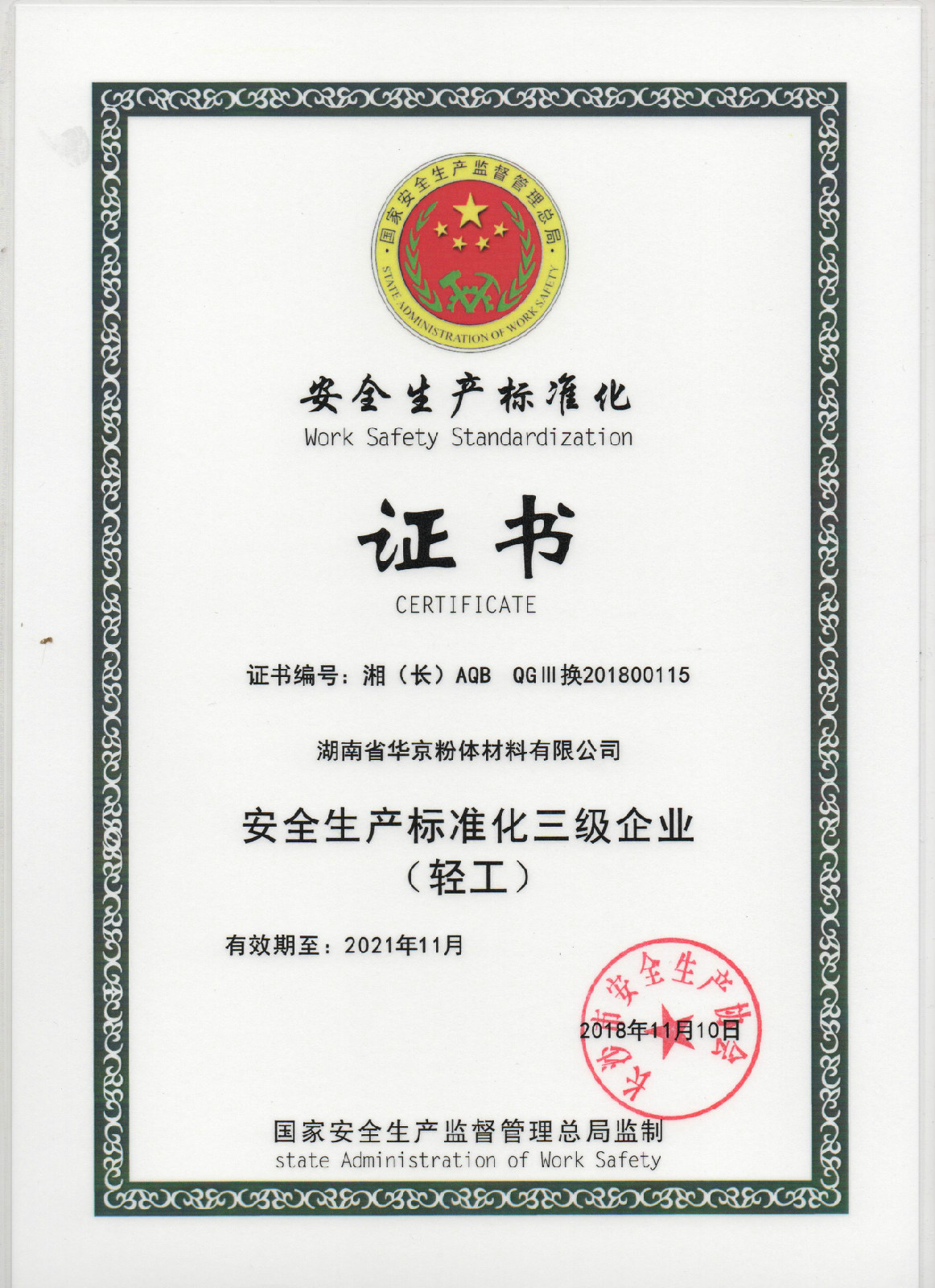 安全生產(chǎn)標準化證書